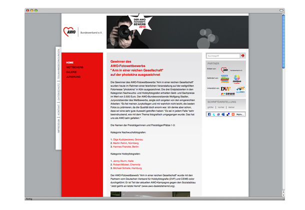 Der AWO-Fotowettbewerb wurde 2010 im Rahmen der Sozialkampagne „Jetzt geht´s ans letzte Hemd!“ ins Leben gerufen. Unter dem Motto „Arm in einer reichen Gesellschaft“ wurden Hobby- und Nachwuchsfotografen dazu aufgerufen, sich mit ihren Fotos zum Thema am Wettbewerb zu beteiligen. Die Resonanz war enorm, über 650 Beiträge wurden eingereicht, die das Thema auf erstaunlich vielseitige Weise interpretiert haben. Partner der Aktion waren der Deutsche Verband für Fotografie und cewe color.