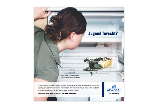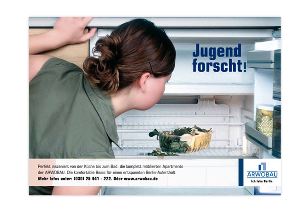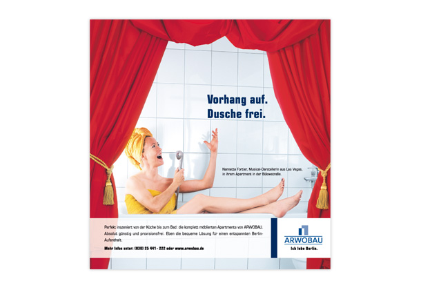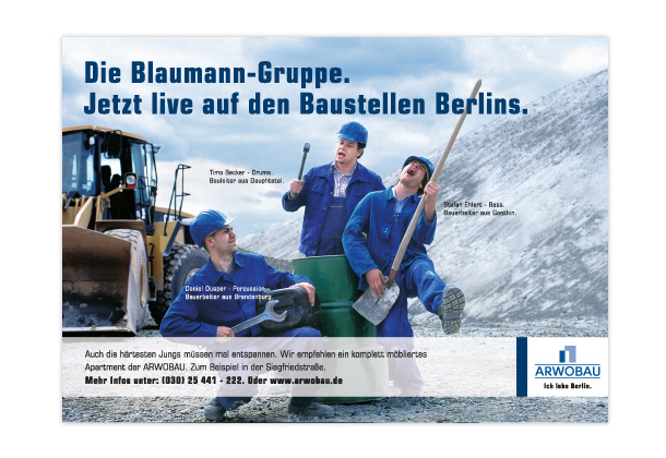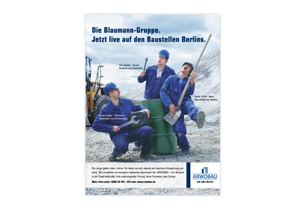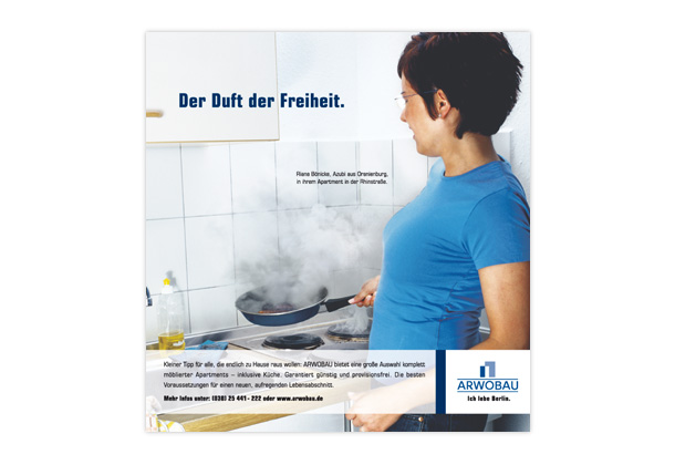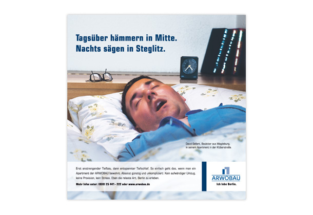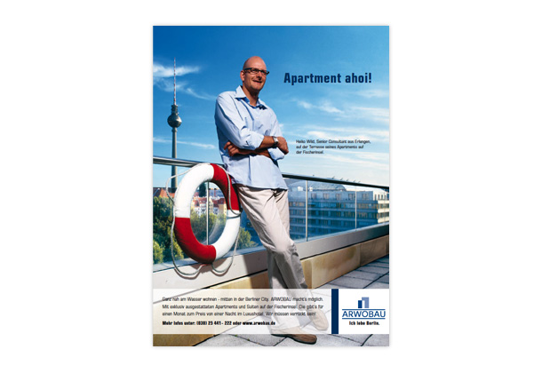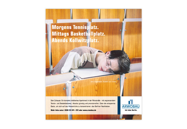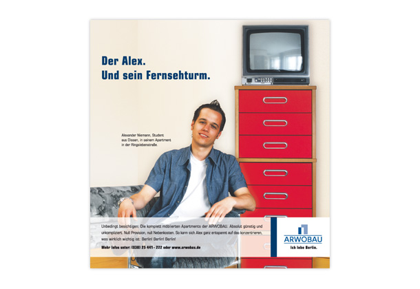 berlinovo (früher ARWOBAU) ist Berlins größter Anbieter von Apartments. Und damit das auch jeder Berliner weiß, wurden wir mit der Entwicklung einer Imagekampagne beauftragt, die drei Monate lang in allen großen Tageszeitungen Berlins geschaltet wurde. Entstanden sind neun Motive, die stets mit einem Augenzwinkern und einem starken Berlin-Bekenntnis in den drei Kernzielgruppen (Bauarbeiter, Studenten, Angestellte) das Apartment-Angebot kommunizieren sollten. Parallel zu den Anzeigen wurden 18/1-Großflächen belegt und Postkarten entwickelt, die flächendeckend in der Berliner Gastronomie gestreut wurden.